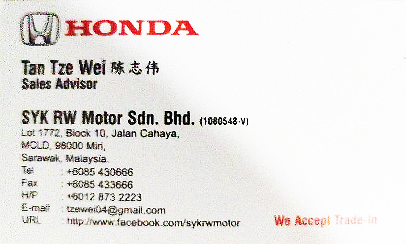 Hi. Saya Tan Tze Wei, Sales Advisor Honda di Miri dengan pengalaman lebih 25 tahun dalam industri automotif di Malaysia.